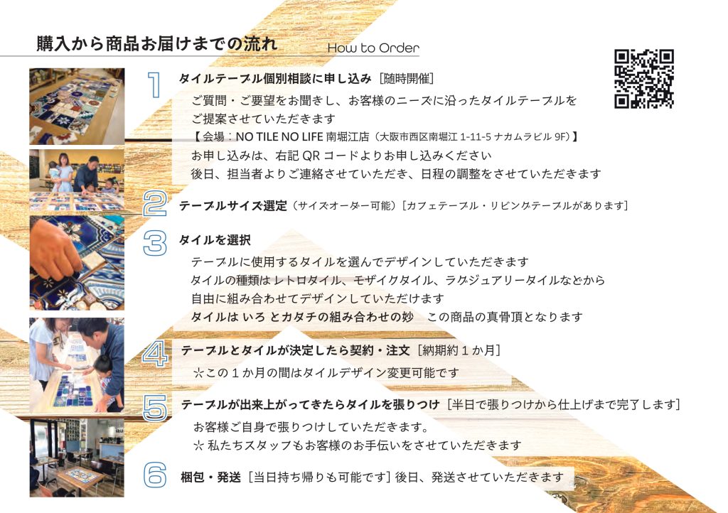 あなた好みのタイルのテーブルを作ってみませんか?テーブルの上にお好きなタイルを並べて、あなただけの特別なテーブルが制作できます。まずは体験会にご参加ください。会場:大阪市西区南堀江1-11-5 ナカムラビル9F Tile Shop NO TILE NO LIFE 南堀江店予約不要です。お待ちしています。